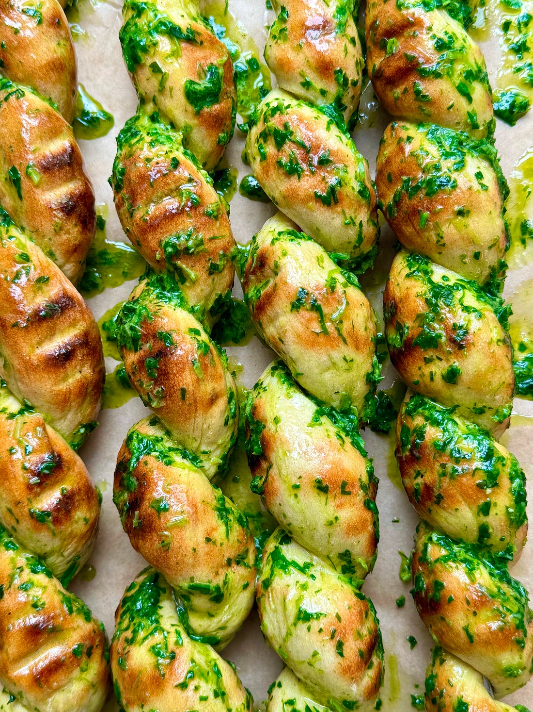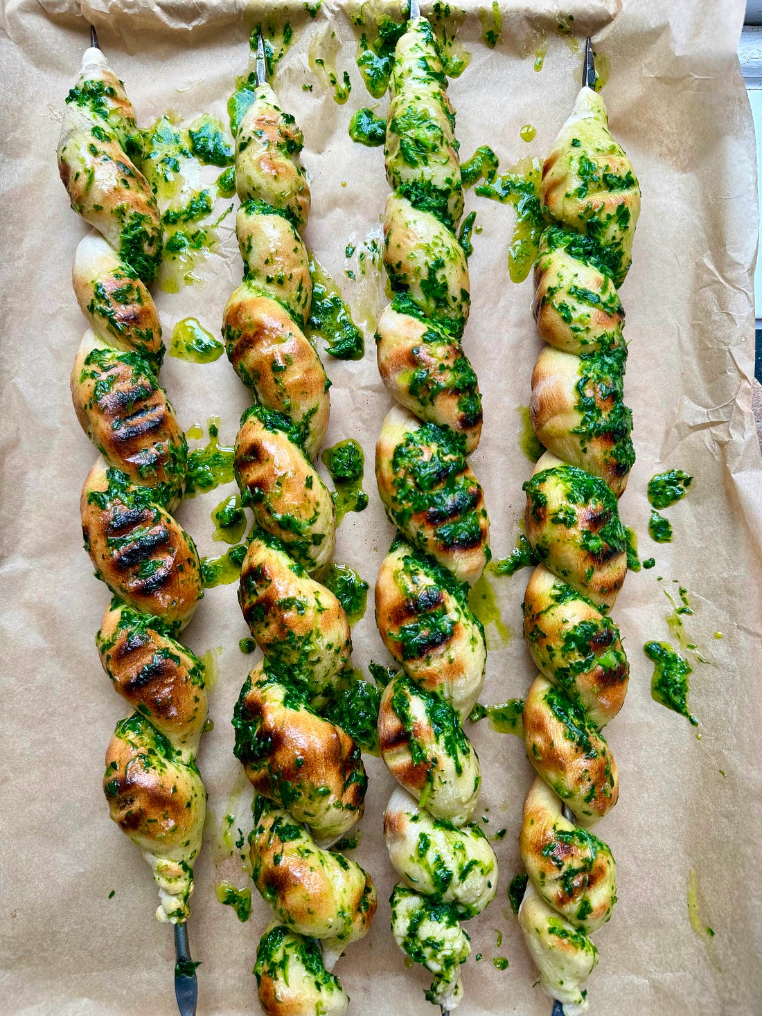 Welcome to Flavour Nuggets! This is the free version of the newsletter. These recipes stay free for 2 weeks, after which they’re auto-paywalled. There’s a second instalment on Fridays for paid subscribers, which contains a brand new recipe. Plus! Paid subs can access the juicy recipe archive, enjoy occasional perks/giveaways, and BTS snapshots of my life as a recipe developer and food writer. All for 87p a week! If that sounds good, go ahead and upgrade by clicking the button below. Hello, hello, and welcome to a new month (alright, so it’s almost a new month, don’t be smart with me) which means a new theme here on Flavour Nuggets, and it is… GREEN! Yes, we’re theming a whole month of recipes around a colour, because it’s offically spring! And what is spring if not perky things on our plates, boinging lambs in our fields and an extra hour of sunshine pelting our pathetic, jaded retinas. Everything is hopeful. Everything is new. Apart from my oven, which is broken. It packed up in a huff and while I wait for an electrician it’s saucepans and the BBQ only. So, it seemed like a good time to test this idea I’ve had knocking around. Still a touch too cold for grilling, you say? You’re going to want to tuck this one away for later, trust me. It’s stupidly easy, they taste incredible, and they’re particularly fun during wild garlic season. Me? I’ve been grilling since January. Not because I love cooking in the pissing rain, but because print publications have long lead times, and I’ve had a bulk of commissions that saw me attempting to channel the Costa Brava when it was, in fact, brassic and raining ENDLESSLY due to - what was it again? - a weather system ‘stuck over Europe’. Six weeks it was hovering there, spewing its misery. Six weeks! But that is a distant memory. Regenerative thoughts only! And what better way to push forward than with these energetic braids. They look like they’d be hard to make but they’re easy, and a much better way of cooking bread on the BBQ than trying to flop it on there where it gets easily misshapen and weird. This is, of course, inspired by damper bread, but instead of using random sticks and a campfire… plus I’ve used a decent dough. I know I will make these all summer long, brushing them with whatever feels seasonal. Hard to beat garlic bread though, isn’t it? Helen x Wild Garlic BBQ Bread Twists You’ll also need skewers, obviously. It’s easier to use thicker ones if you have them. Poolish 150g salted butter