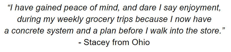 Plus you'll be able to use the more advanced techniques that allow you to really streamline your efforts, rack up the savings, spend less time in the kitchen, AND keep up with it each week without getting overwhelmed.