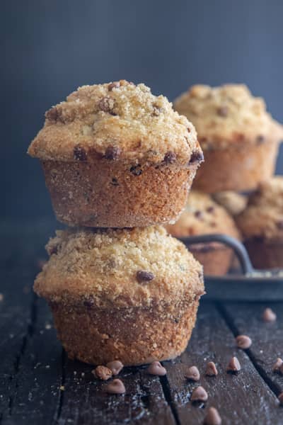 These Chocolate Chip Muffins make the perfect breakfast or snack idea. So easy to make. They are a soft moist muffin with a delicious crunchy streusel topping. A delicious treat for anytime!