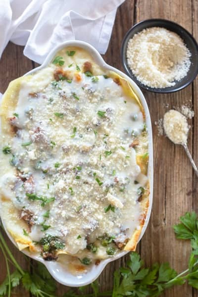 Homemade Creamy White Sauce Lasagna, an easy delicious Italian Lasagna Recipe, layered with peas, sausage, mushrooms and the perfect White Sauce. It just might become your new favourite Pasta Dish.