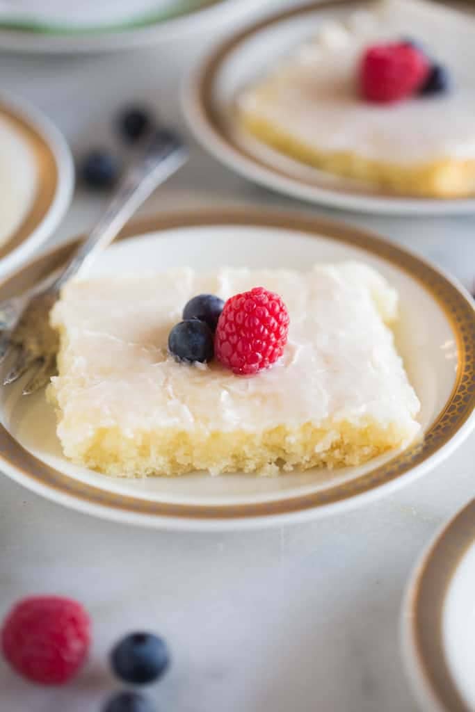 This moist, flavorful cake is tucked under a soft blanket of frosting with hints of vanilla and almond. You can dress it up with fruits of the season, from summer berries to the jewels found inside winter pomegranates.
