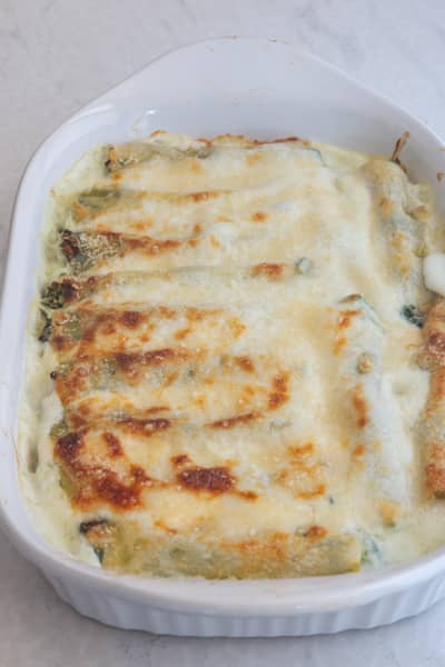 This delicious Spinach Ricotta Cannelloni is baked in a simple white sauce and sprinkled with grated Parmigiano. It is the perfect special occasion or just because baked pasta dish.