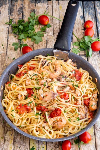 This Italian Seafood Pasta is the perfect combination of your favourite seafood mix, a few fresh grape or cherry tomatoes and spices tossed with spaghetti. Quick and easy, Italian never tasted so good!
