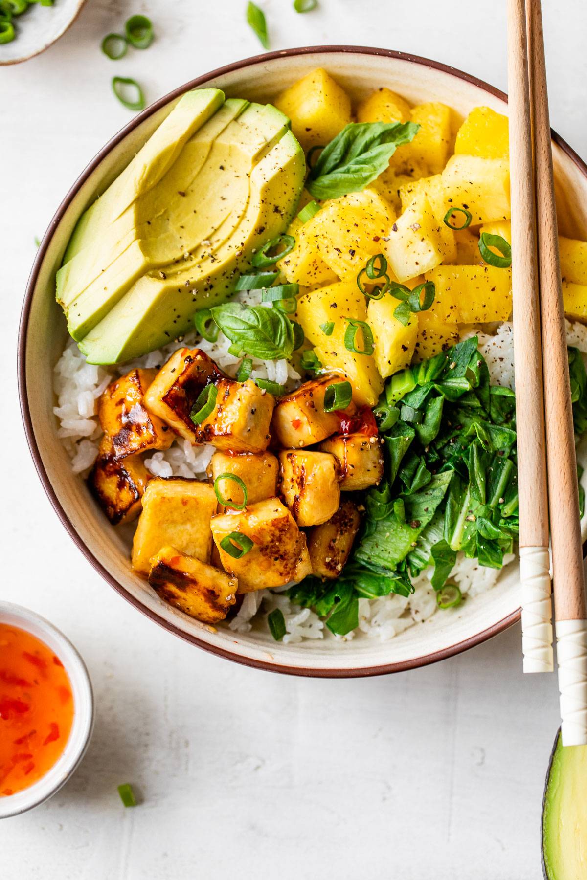 This Tofu Coconut Rice Bowl is made with coconut rice, then topped with crispy tofu, pineapple, bok choy, and avocado, all drizzled in a sticky sweet chili garlic sauce! Such an easy dinner if you're looking to add a plant-based recipe to your meal rotation.