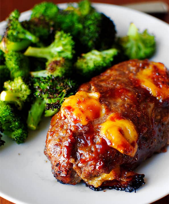 Chunks of melty cheddar cheese stud this BBQ flavored ground beef meatloaf, which is shaped into mini loaves to help with portion control and also because individual servings of any recipe are just more fun to eat. 😉