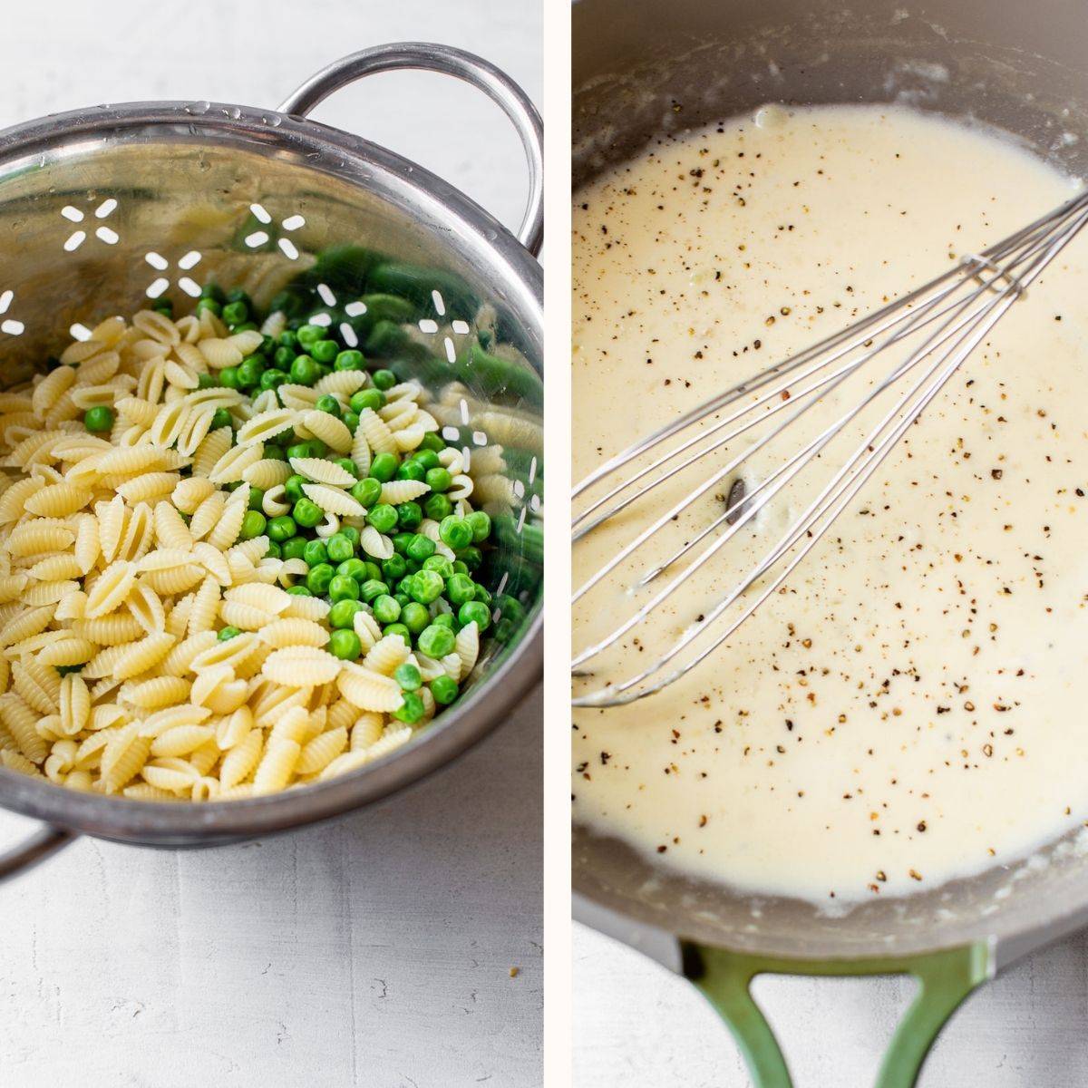 1. Bring a large pot of water to a boil, then cook the pasta for approximately 5 minutes before adding in the peas. Continue cooking until the pasta is cooked to your liking, then drain.