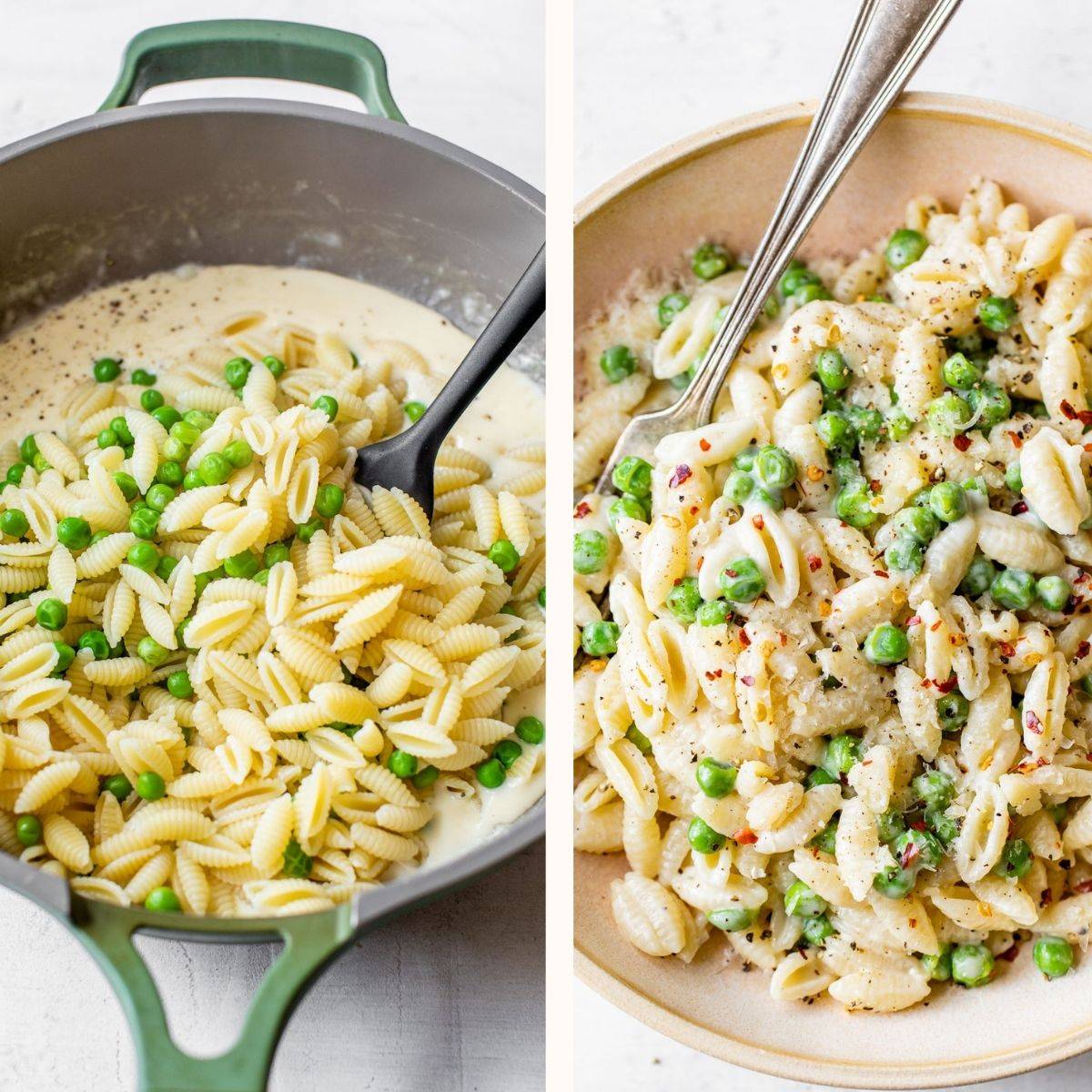 4. Once the cheese has melted, remove the skillet from the heat and add in the cooked pasta and peas. Use a rubber spatula or wooden spoon to stir so that the pasta is completely coated in the sauce. Add salt and pepper to taste (and maybe even some red pepper flakes!) and enjoy.