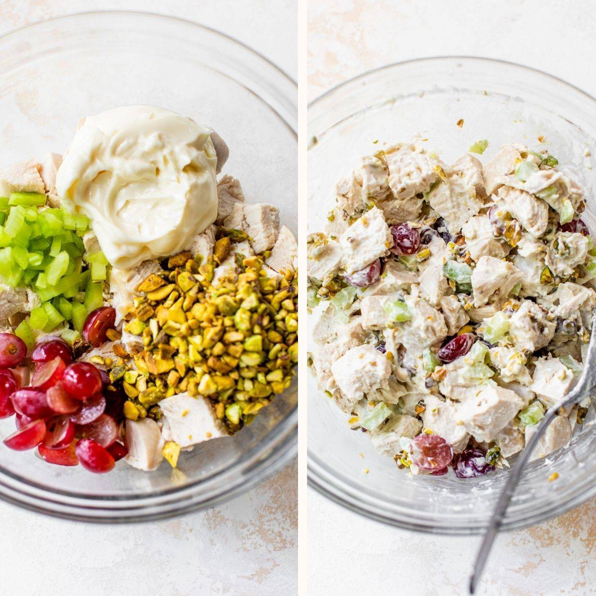 2. Next, add the chicken to a large bowl, along with the pistachios, celery, grapes, and black pepper. Last, add the mayo, then use a large spoon to stir everything together until the chicken is coated.