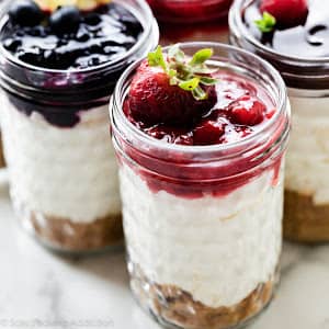 No bake cheesecake jars are a fun individual dessert to serve when you're short on time and don't feel like turning on the oven. There's no baking involved and you only need a handful of ingredients. Readers have reported they enjoy topping the jars with strawberry sauce, chocolate ganache, salted caramel, lemon curd, and more.