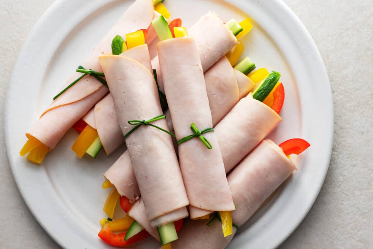 Deli meat roll-ups are some of my favorite high-protein snacks to keep in the cooler on a road trip! Roll them up before you hit the road, stick them in the cooler, and grab one or two instead of swinging through the drive through!