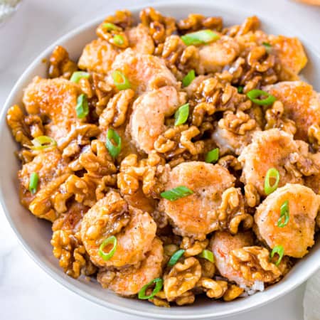 Crispy shrimp are coated in a dreamy, creamy honey sauce and topped with candied walnuts. A total showstopper and so much better than takeout!