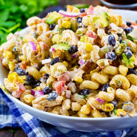 Chipotle Chicken Pasta Salad is full of chicken, black beans, corn, avocado, and Rotel tomatoes all tossed in a creamy, smoky dressing. There's tons of southwestern flavors in this pasta salad. Makes a great summer potluck side or light meal.