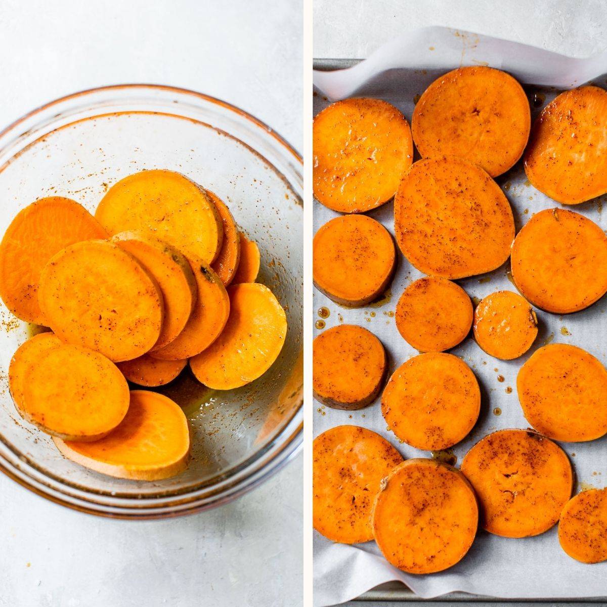 1. Preheat the oven to 425° and line a large baking sheet with parchment paper. Slice the sweet potato into 1/4" rounds. No need to peel it! Transfer the potato rounds to a large bowl.