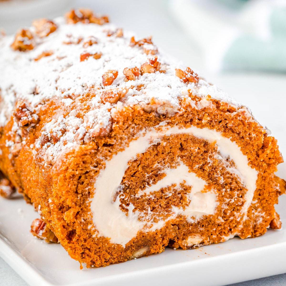 This Praline Pumpkin Roll recipe makes an impressive dessert! The spiced pumpkin roll is elevated with a caramel praline cream filling and studded with candied pecans. It is decadent, stunning and the perfect finish to a holiday meal!