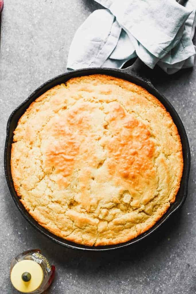 Simple and delicious this Skillet Cornbread recipe is made with real corn, cornmeal, buttermilk, and basic pantry ingredients and baked in a cast iron skillet.