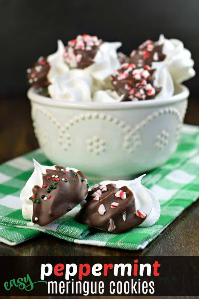 Melt in your mouth, Peppermint Meringue Cookies, dipped in dark chocolate, just in time for the holidays. You'll want to add a handful of these sweet cookies to all your holiday plates!