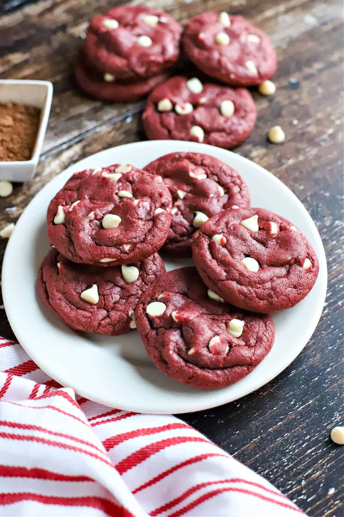 Light cocoa flavor and a gorgeous scarlet hue make these Red Velvet Cookies irresistible. With white chocolate chips in each bite, these melt-in-your-mouth cookies add sweetness to Valentine's Day. . .or ANY day!