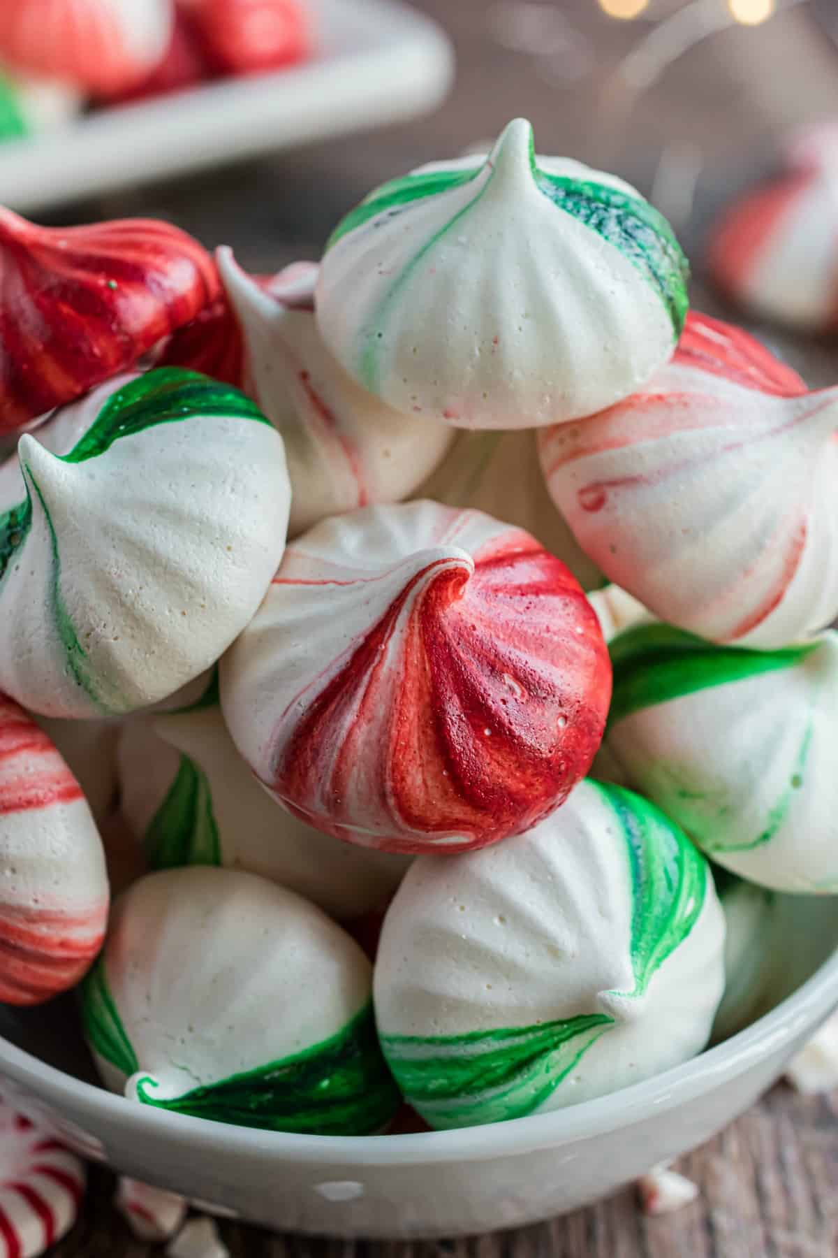 Melt in your mouth Minty Meringue Cookies are the perfect Christmas treat. Light and airy cookies with a peppermint flavor, these look so pretty on your holiday dessert plates.