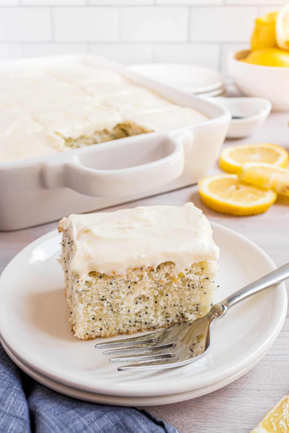 This moist Lemon Poppy Seed Cake is speckled with poppy seeds and topped with rich cream cheese frosting. Fresh flavor from real lemon zest makes this cake irresistible to lemon lovers! Made in a 13×9 baking dish for easy assembly!