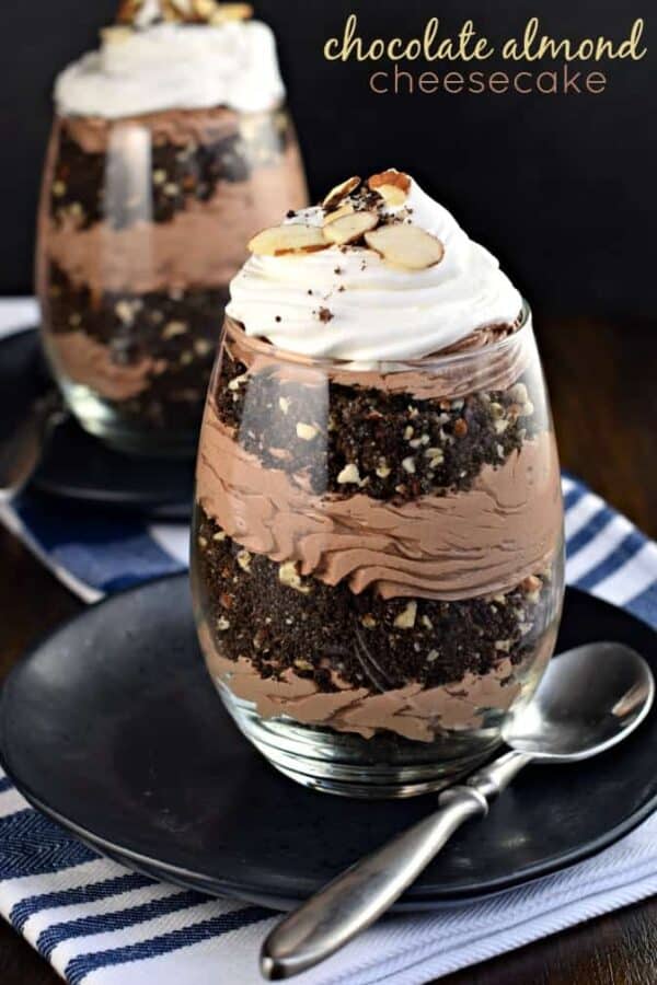 Beautiful layered Chocolate Almond Cheesecake Parfait! Chocolate sandwich cookies with almonds to create a crunchy crust, with a creamy chocolate cheesecake! Perfect for two!