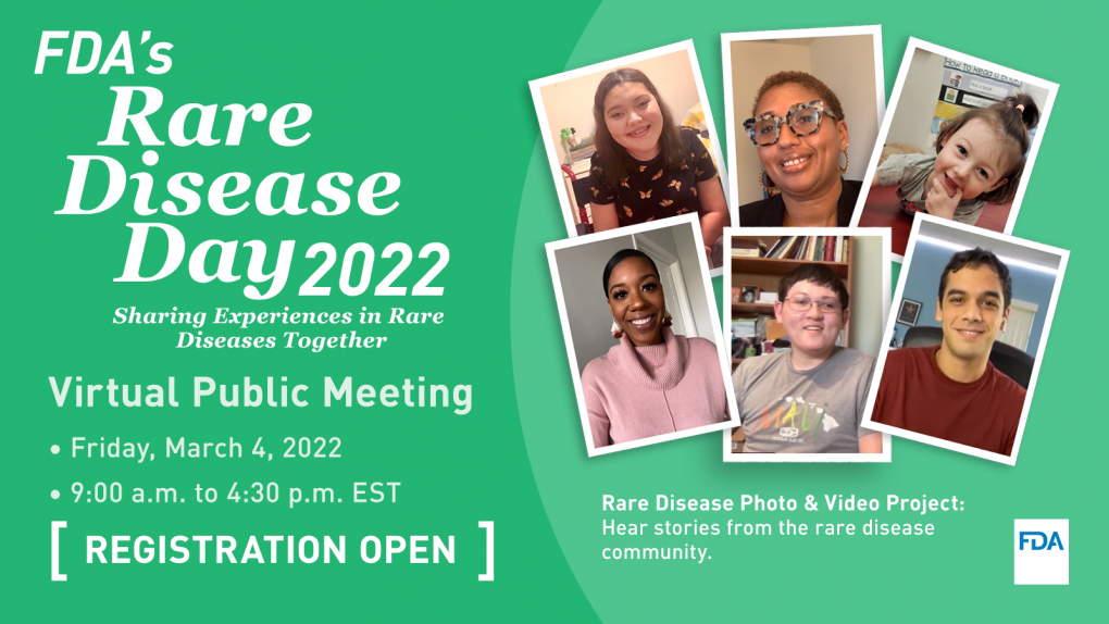 FDA will host a virtual public meeting on March 4, 2022, 9:00 am to 4:30 pm EST, to join the global observance of Rare Disease Day. The theme for FDA's Rare Disease Day is "Sharing Experiences in Rare Diseases Together." During the meeting, various stakeholders will share their perspectives on and experiences in rare disease product development. Please visit the public meeting page to register for the event. If you are a rare disease patient, caregiver or advocate who is interested in speaking on a panel about your engagement with FDA, please indicate so in your registration. We also encourage you to add a comment to the public docket FDA-2022-N-0116. To learn more about other activities relevant to rare diseases and listen to stories from the rare disease community and FDA staff working on rare diseases, please visit the Office of Orphan Product Development's Rare Disease Day webpage. |