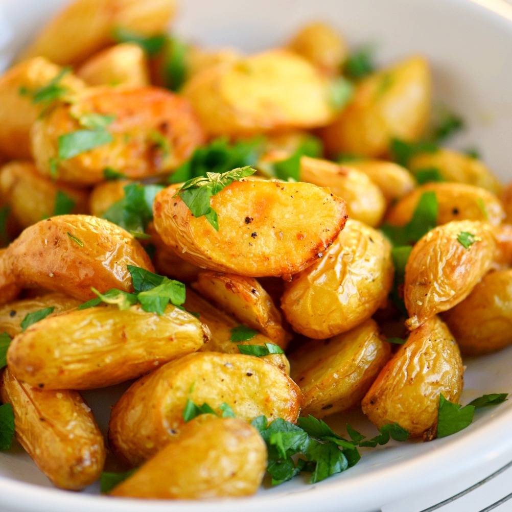 These Garlic Roasted Potatoes are the perfect side dish! Perfectly crispy on the outside and tender and fluffy on the inside, these Garlic Roasted Potatoes will soon become a family favorite! This versatile recipe is great with all manner of entrees and can be scaled up to feed a crowd. Serve alongside Broccoli Salad, The BEST Chicken Marinade, and Cheesy Bacon Ranch Bread for the ultimate meal!