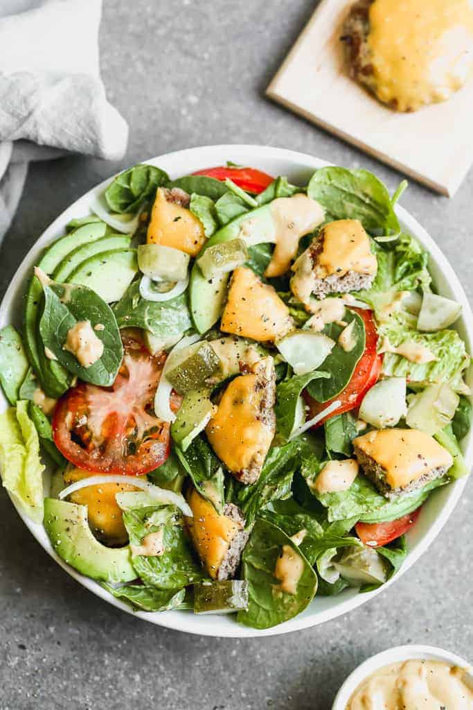 Healthy and low carb Cheeseburger Salad includes all of our favorite burger toppings and a simple homemade dressing piled onto a delicious, hearty salad.