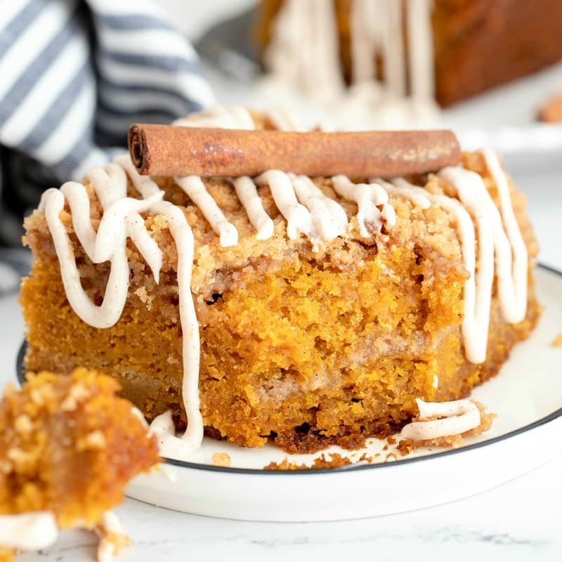 To top things off, I made a cream cheese glaze to drizzle over the crumb cake. Every bite of this dessert has the perfect balance of cinnamon crumb, moist pumpkin cake and creamy frosting.