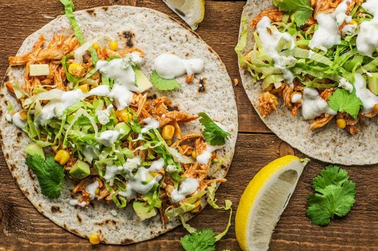 Soft tortilla shells cradle a mixture of savory buffalo chicken and corn kernels.