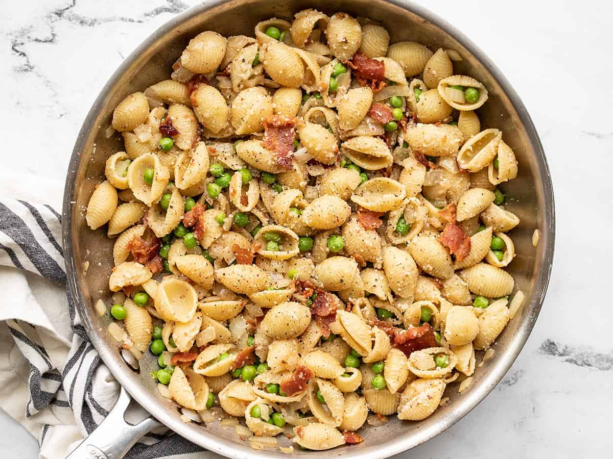 It's always a good idea to rummage through your pantry and freezer every week to see what ingredients you might need to use up. This week for me it was a half box of pasta, some frozen bacon, and frozen peas that were almost too frosty. So I took my favorite quick meal template (pasta + Parmesan + greens) and added in bacon for a simple and delicious meal. This Pasta with Bacon and Peas is definitely going on my regular rotation list!!