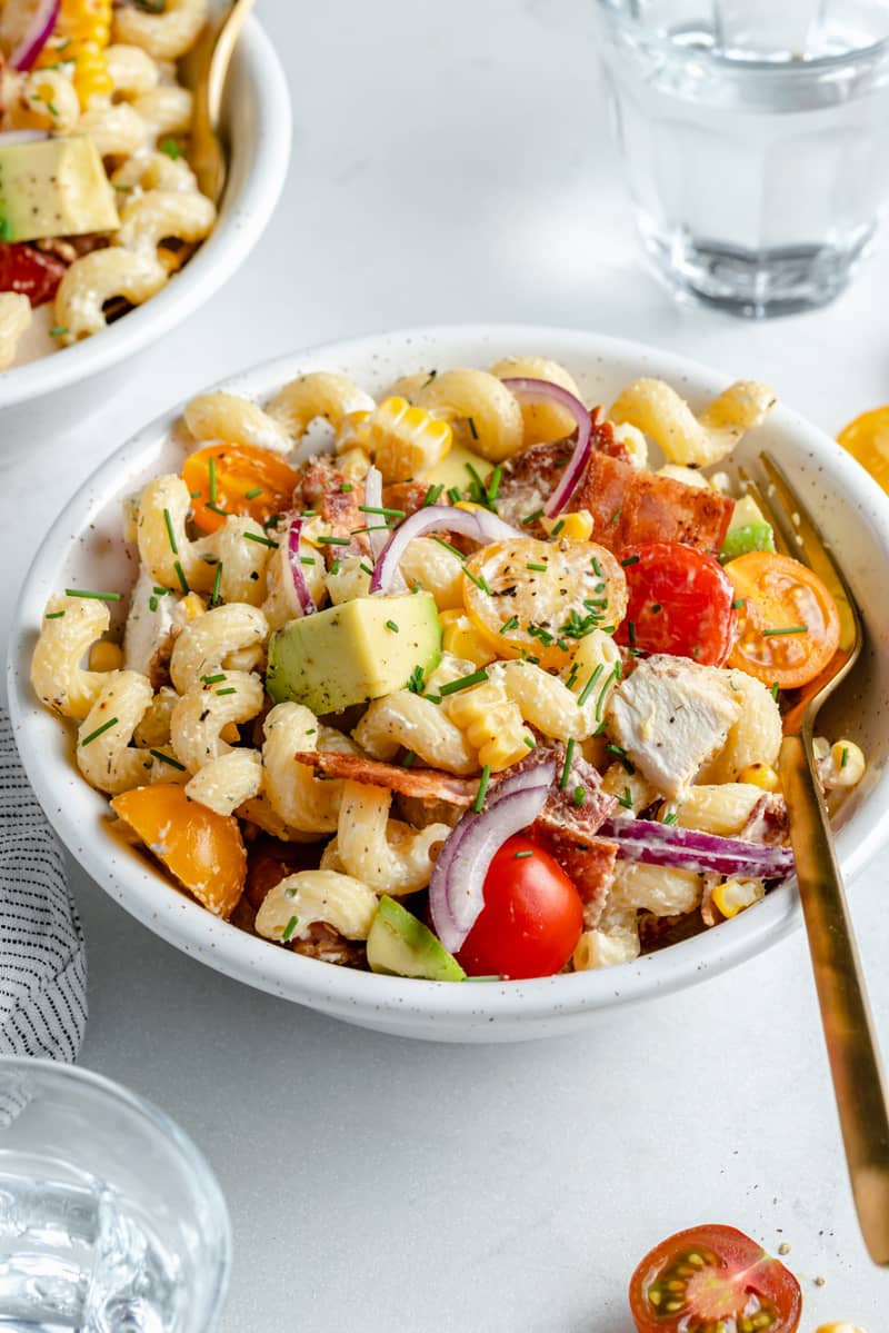 Delicious chicken bacon ranch pasta salad packed with juicy tomatoes, sweet corn, zippy red onion and creamy avocado. This wonderful, easy chicken bacon pasta salad is perfect for customizing and is guaranteed to be a hit all summer long! The best side or main dish for BBQ's, parties and potlucks.