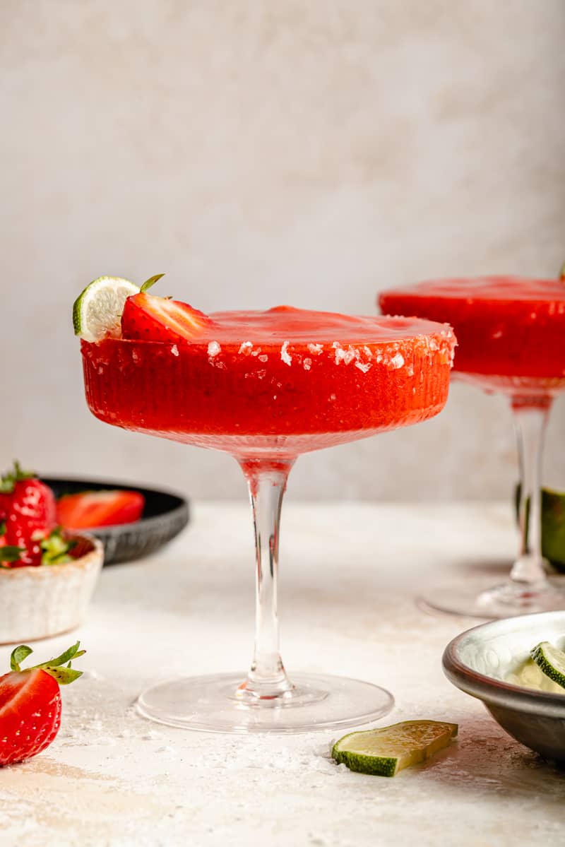 |  Frozen Strawberry Margarita Gorgeous frozen strawberry margarita made with 4 simple ingredients for a fun, refreshing summer cocktail! This easy frozen strawberry margarita recipe takes just 5 minutes to make and is perfect for summer parties, BBQs, date nights and girls' nights. Double or triple to serve a crowd! READ: Frozen Strawberry Margarita |