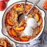 In this easy peach crisp recipe, an oat and nut topping covers a juicy layer of fresh peaches. Serve it with vanilla ice cream for a perfect summer dessert.