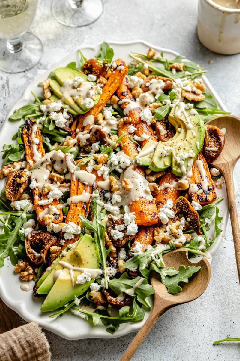 Beautiful grilled carrot arugula salad with sweet dried figs, tangy goat cheese, creamy avocado and crunchy walnuts. Drizzle this fresh arugula and carrot salad with a flavorful maple tahini dressing for a wonderful lunch or easy side dish! Options to grill or roast the carrots for ease.