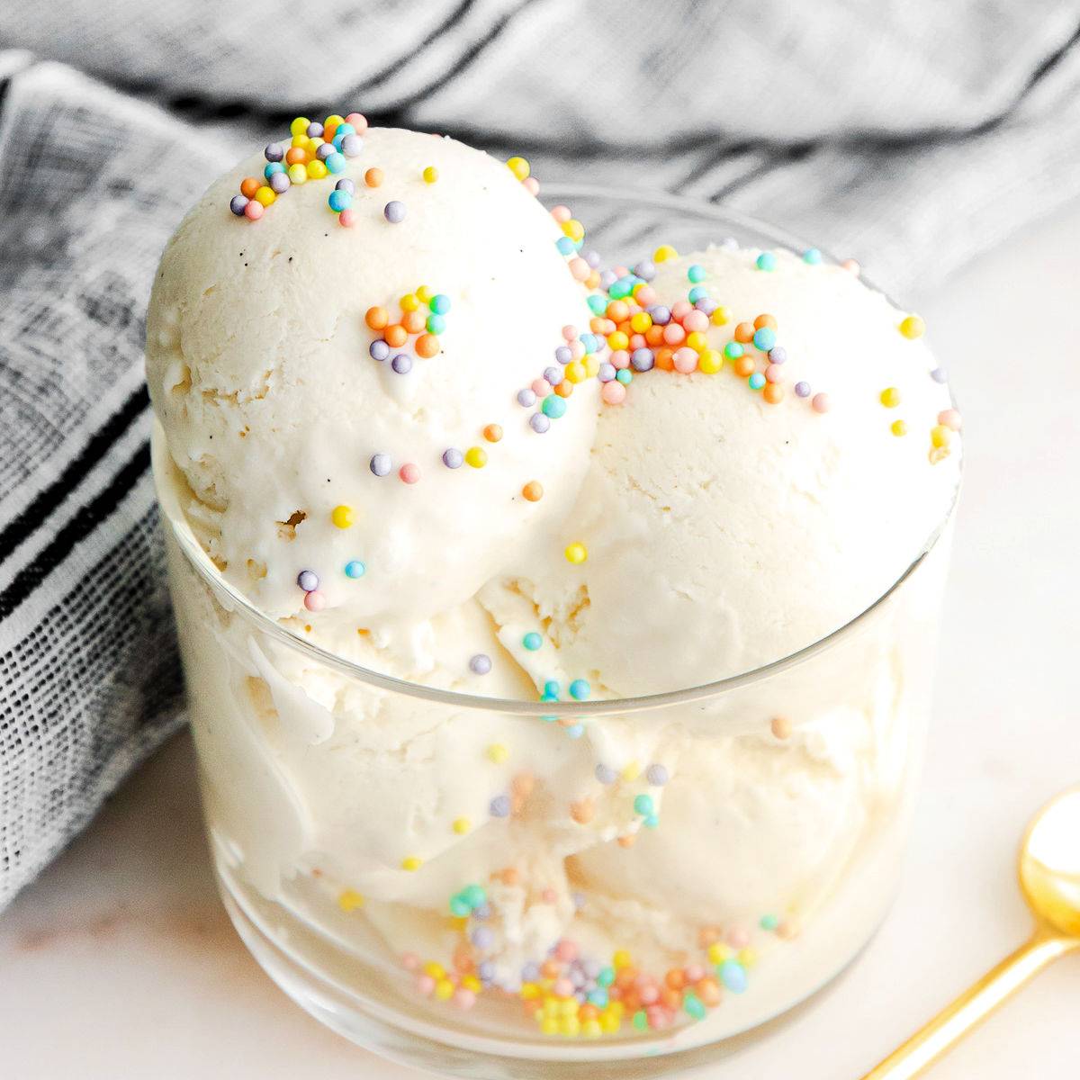 Vanilla Ice Cream is made with just three ingredients and a few simple steps. This delicious no churn vanilla ice cream recipe is so quick and easy to make. Top with hot fudge, caramel sauce, fresh fruit, whipped cream or sprinkles for an easy to make dessert that no one can resist.