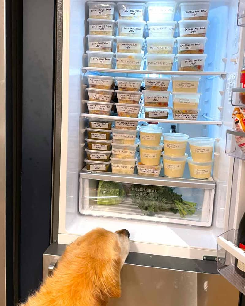 They were all stashed in the fridge that usually houses Dozer's food and bones. So he was a bit confused / hopeful / delighted / "just checking things out" / concerned about where his bones have gone. That's a LOT of thoughts going on inside that golden furry head of his!! 😂