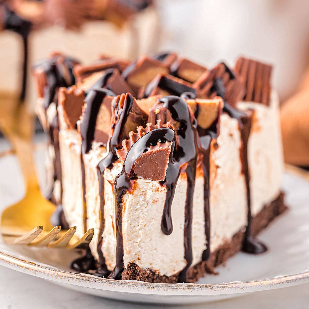 This easy Reese's No Bake Peanut Butter Cheesecake is the perfect dessert for peanut butter lovers. A tantalizing combination of cheesecake, peanut butter and chocolate, this no bake cheesecake is perfectly creamy and topped with Reese's peanut butter cups and hot fudge for an irresistibly decadent dessert that's perfect all year round!