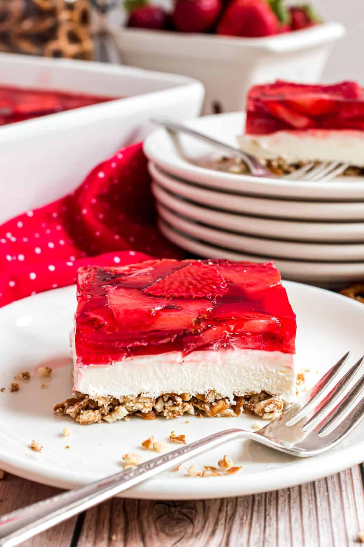 This Strawberry Pretzel Salad recipe is the perfect sweet and salty combination! A light cream cheese filling, crunchy pretzel crust and fresh strawberry JELLO topping make these bars totally irresistible.