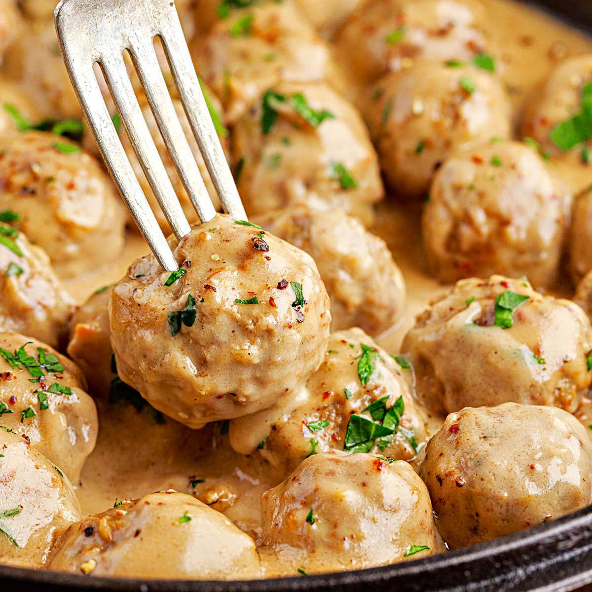 This Swedish Meatballs recipe is the ultimate comfort food dish! Juicy, flavorful meatballs topped with a rich, creamy sauce, served over a bed of your favorite starchy side will feed the whole family with plenty of leftovers. Perfect for a cozy night when you're looking for an easy, yet hearty meal.