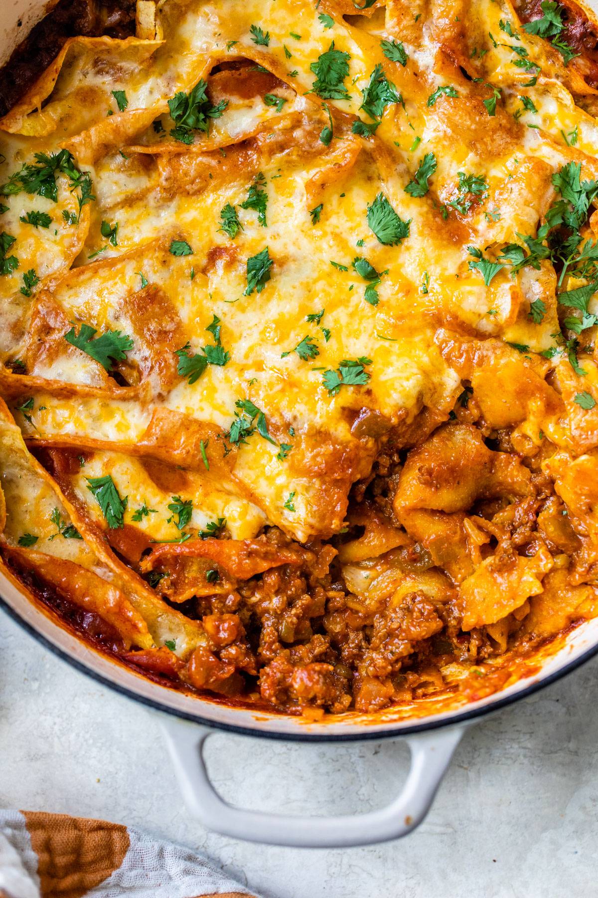 Who doesn't love a one pan meal?! This recipe is essentially deconstructed enchiladas: beef, green chiles, enchilada sauce, and plenty of cheese make this an easy family favorite.