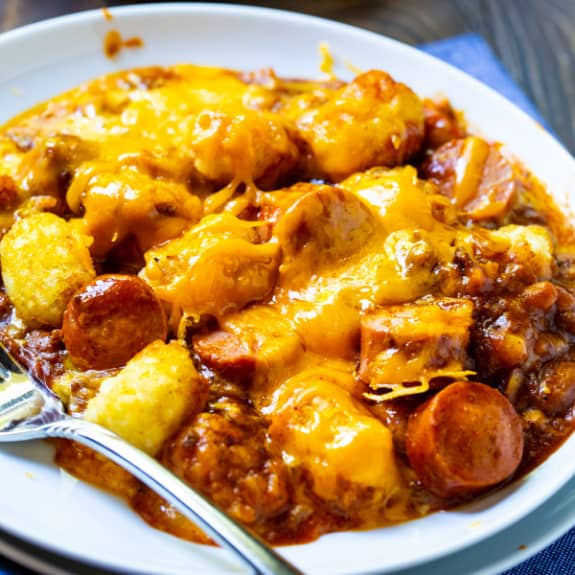 Cheesy Hot Dog Tater Tot Casserole is pure comfort food. Sliced hot dogs, chili, tater tots, and cheddar cheese combine to make an easy and delicious meal. This redneck casserole is sure to be a family favorite.