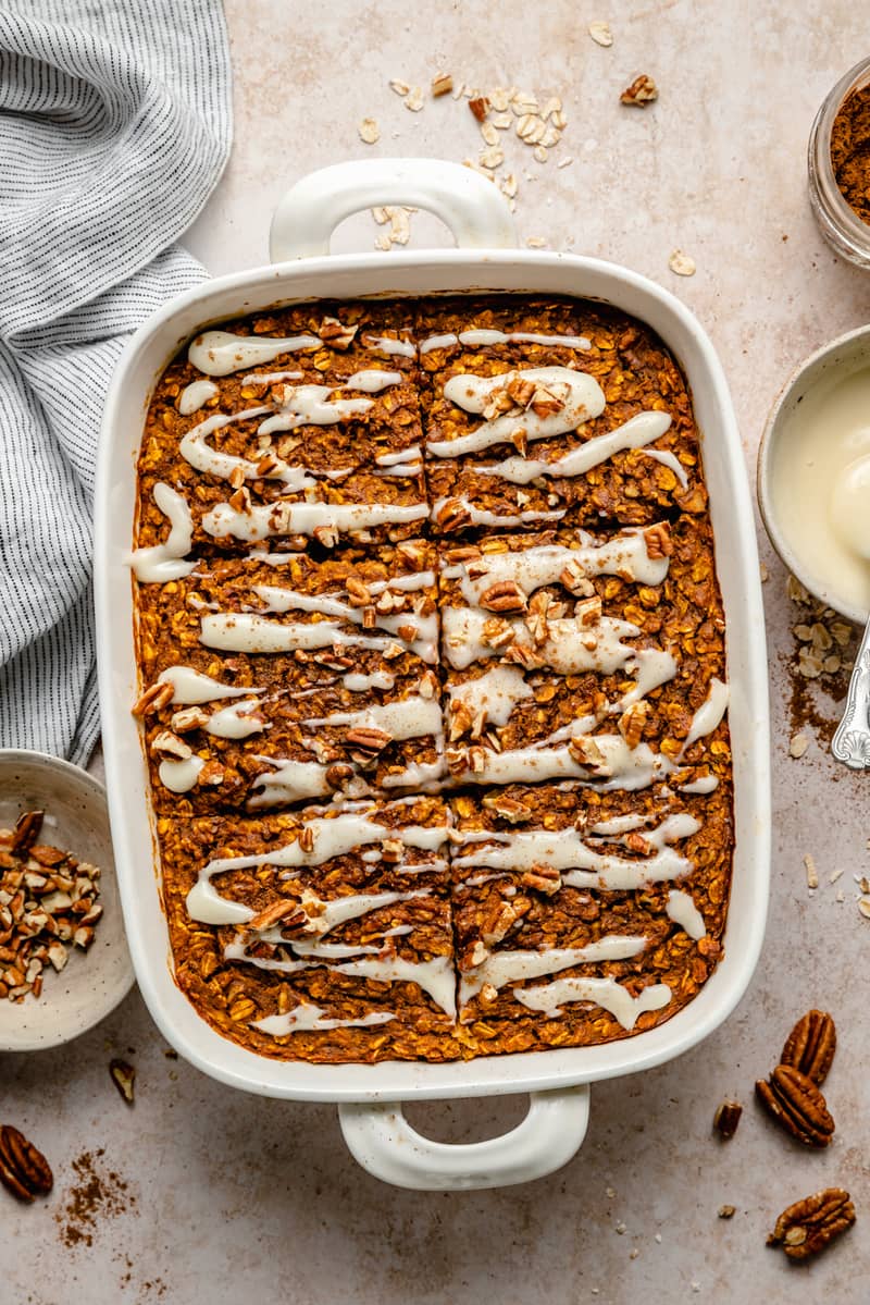 Ambitious Kitchen  | |  Pumpkin Pie Baked Oatmeal Cozy and delicious pumpkin baked oatmeal that truly tastes like your favorite pumpkin pie! This nutritious pumpkin oatmeal bake uses up a whole can of pumpkin puree and is filled with warming spices. Options to add chopped nuts and a lovely cream cheese glaze for an extra treat! The perfect healthy breakfast for fall that's freezer-friendly.