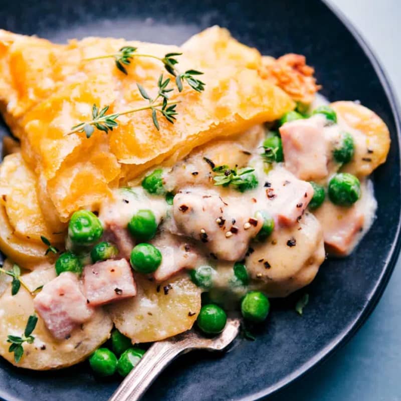8. Ham and Potato Pot Pie: This Ham and Potato Pot Pie combines cheesy au gratin potatoes, sweet peas, and smoky ham in a delicious casserole topped with flaky puff pastry.