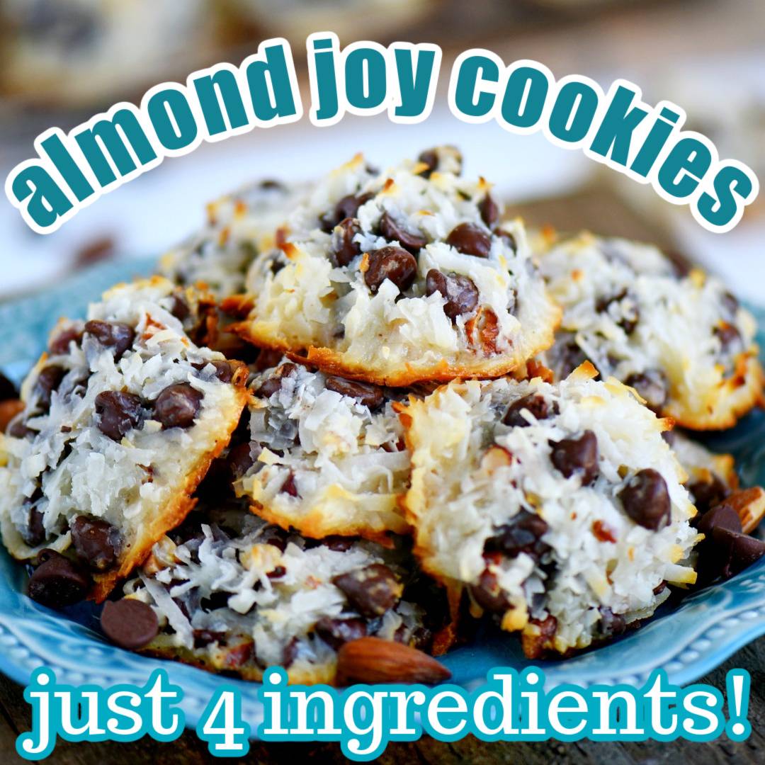 If you love coconut, boy are you in for a treat today! These easy Almond Joy Cookies take just four ingredients and don't even require a mixer! No beating, no chilling, just mix 'em up and throw 'em in the oven EASY! You're going to love these ooey gooey fabulous cookies!