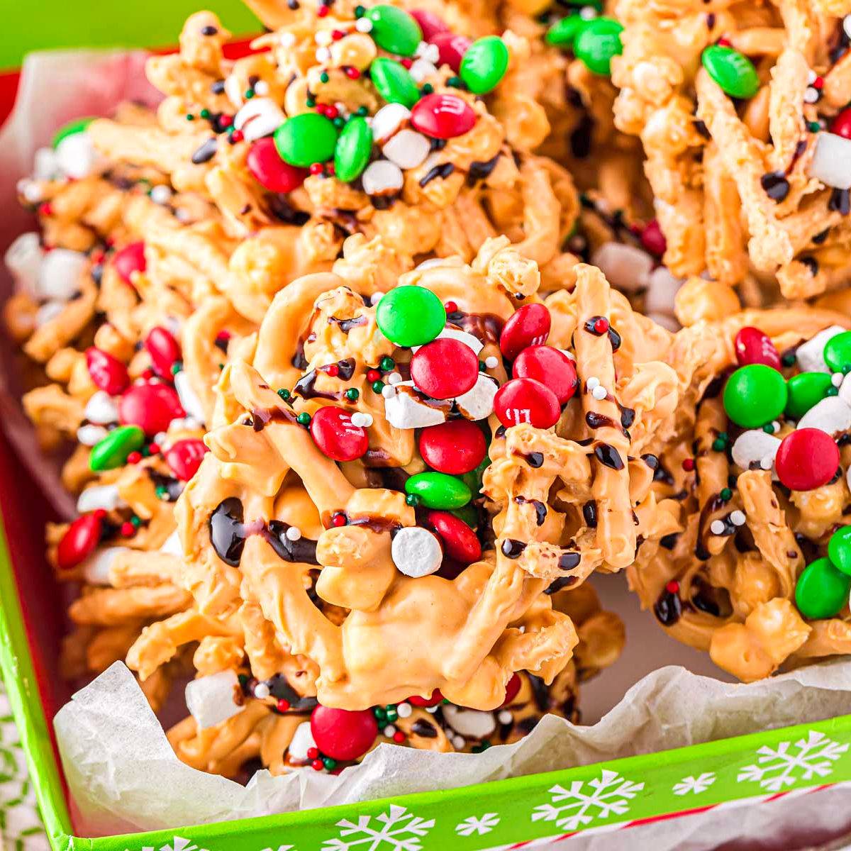 Over the top Buddy the Elf Cookies take your classic Haystacks recipe and add all the toppings you would expect from Buddy! Better than your average North Pole treat, these easy no bake Elf Cookies are a total showstopper and perfect for movie night, Christmas cookie trays and holiday parties!