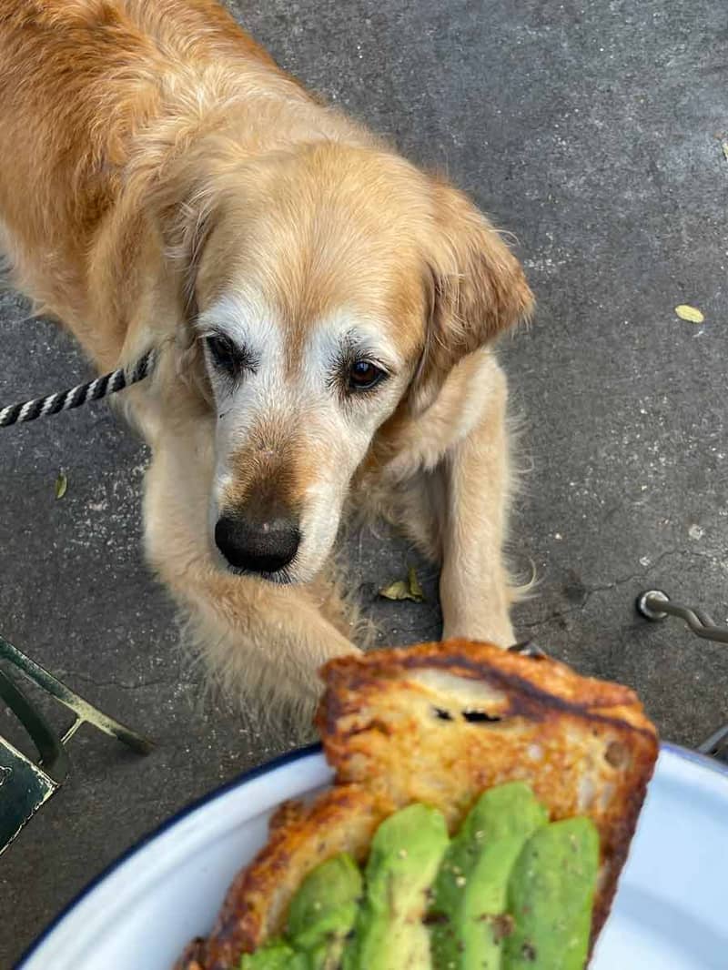 Leisurely Saturday morning breakfast - on standby to hoover up the hunk of toast that "accidentally" falls to the ground.
