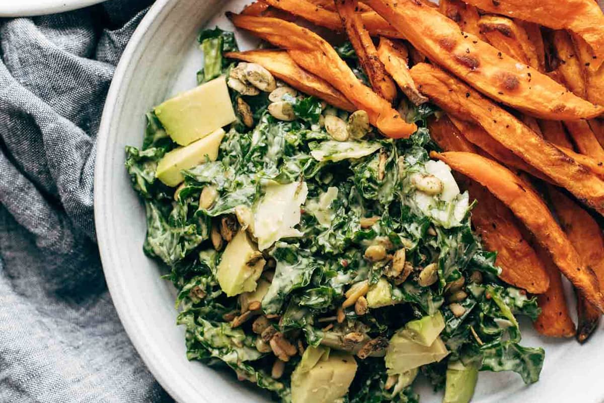This salad is life-changing! Kale, avocado, and crunchy seeds drenched in a quick and creamy avocado caesar dressing that can easily be made vegan. Plus, FRIES! Who doesn't love crispy fries with a salad? Yes, please.