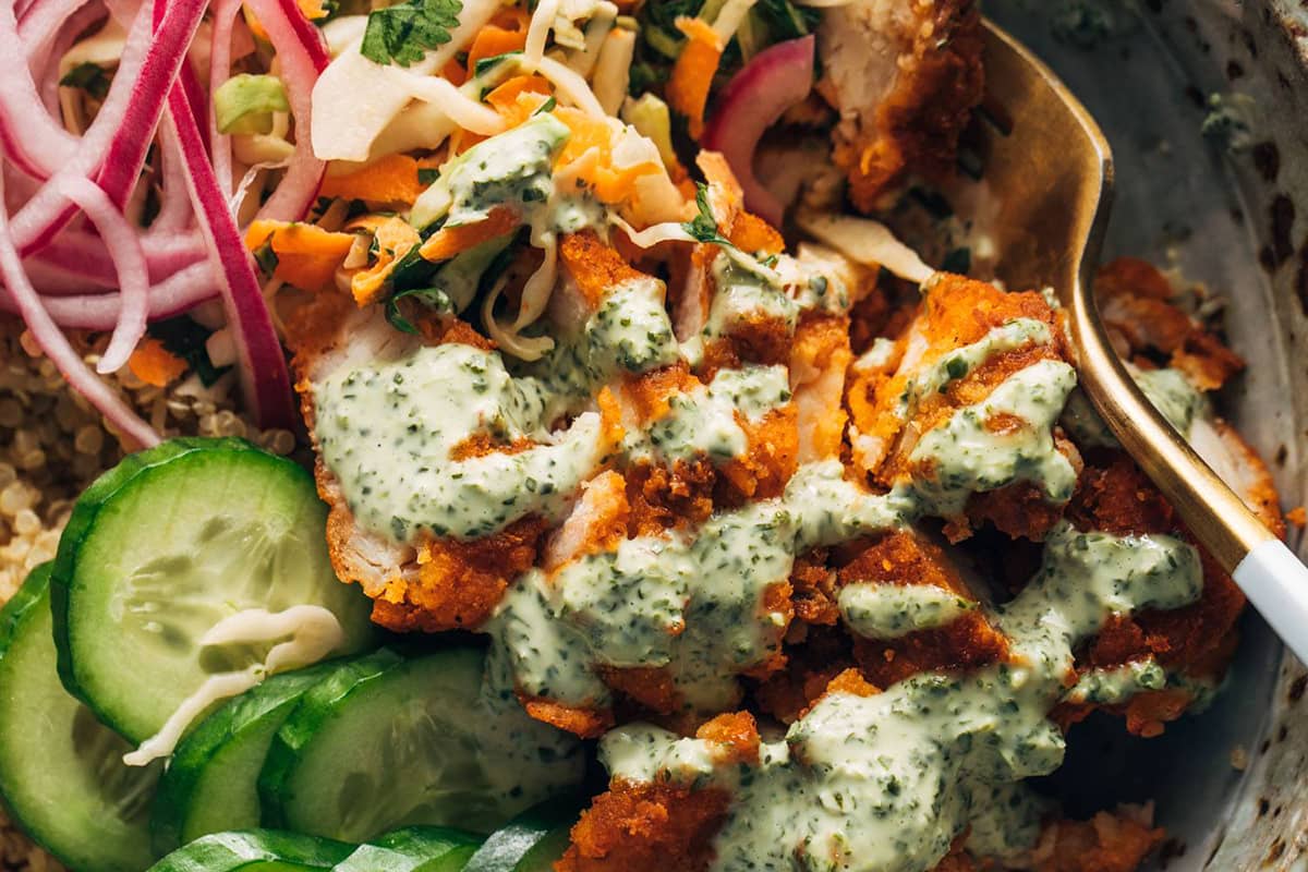 Please make space in your hearts and your bellies for this incredibly addicting chicken tikka bowl situation. Loaded up with crispy chicken tenders, cool cucumbers, creamy slaw, quick pickled onions, and a drinkable mint sauce on top.