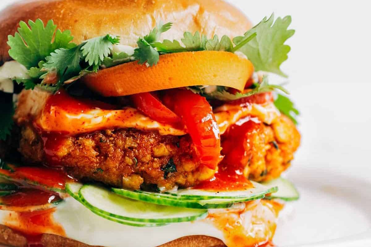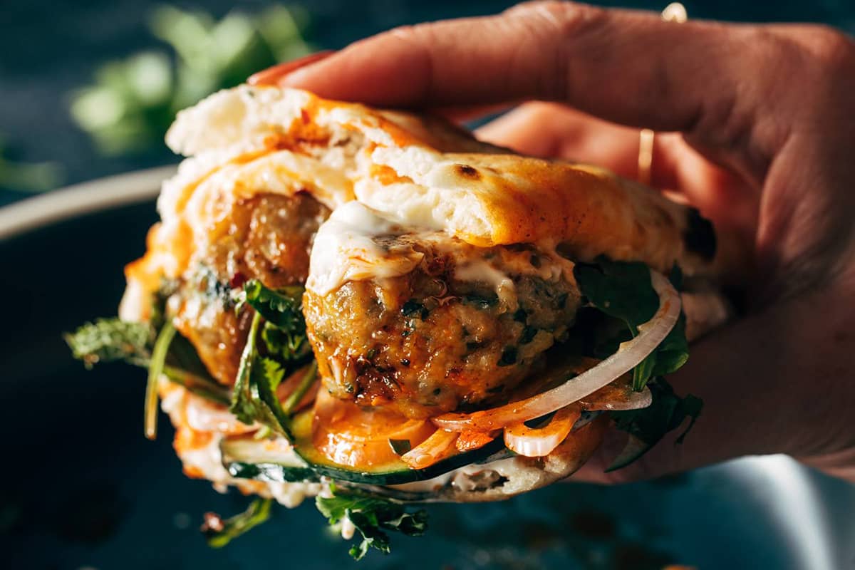 Golden brown chicken meatballs cozied up next to fixings like cucumbers, shallots, kewpie mayo, mint, a bit of chili crisp, and some fresh cilantro to make the ultimate chicken sandwich!