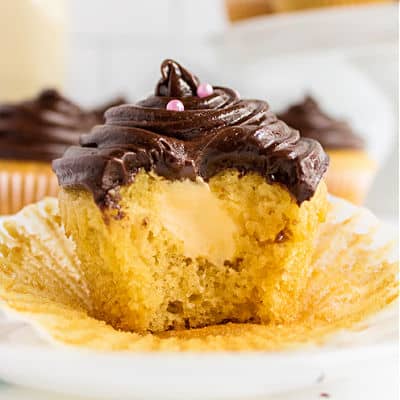 I love these Boston Cream Cupcakes because at first glance they look like ordinary yellow cupcakes with chocolate frosting.